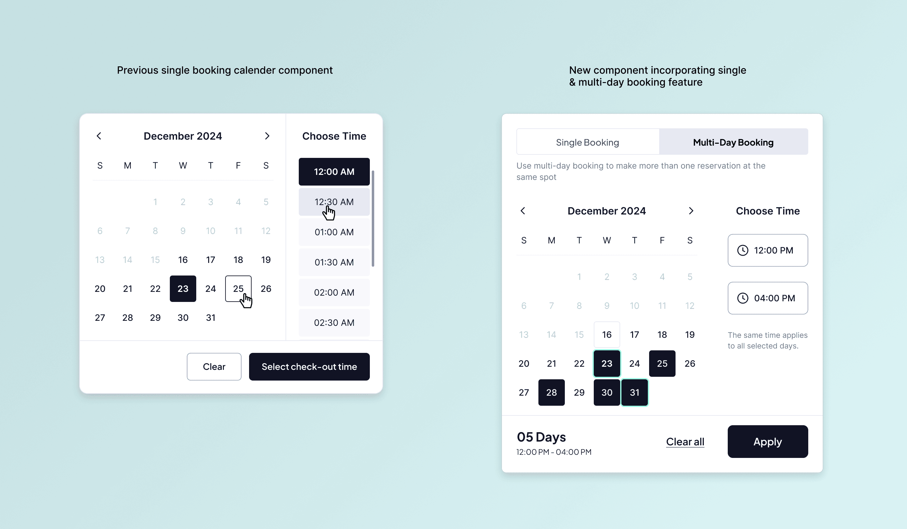 To address key pain points and improve the booking experience, a new Multi-Day Booking flow was introduced - featuring a flexible calendar component design that enables users to book multiple days effortlessly within a single flow.