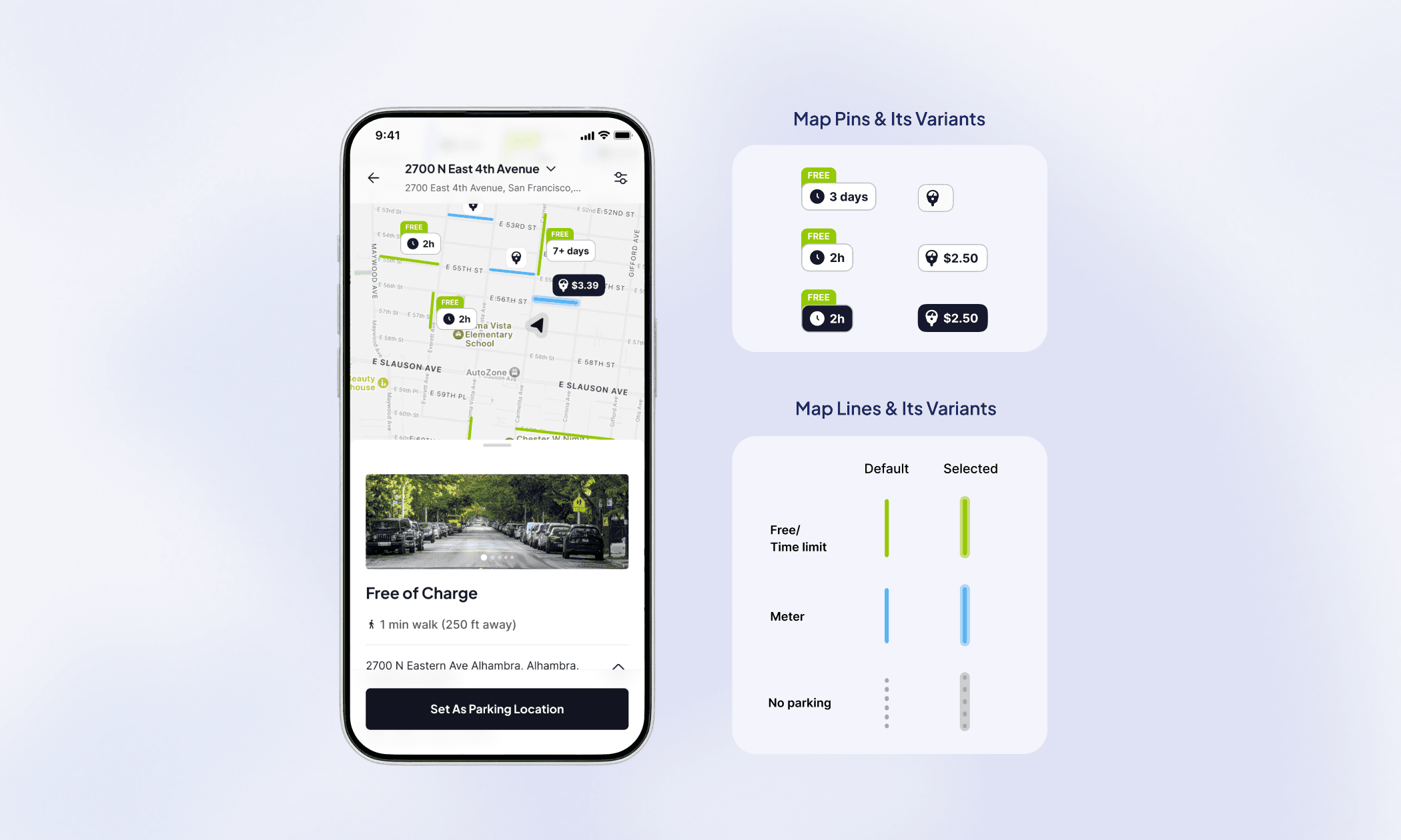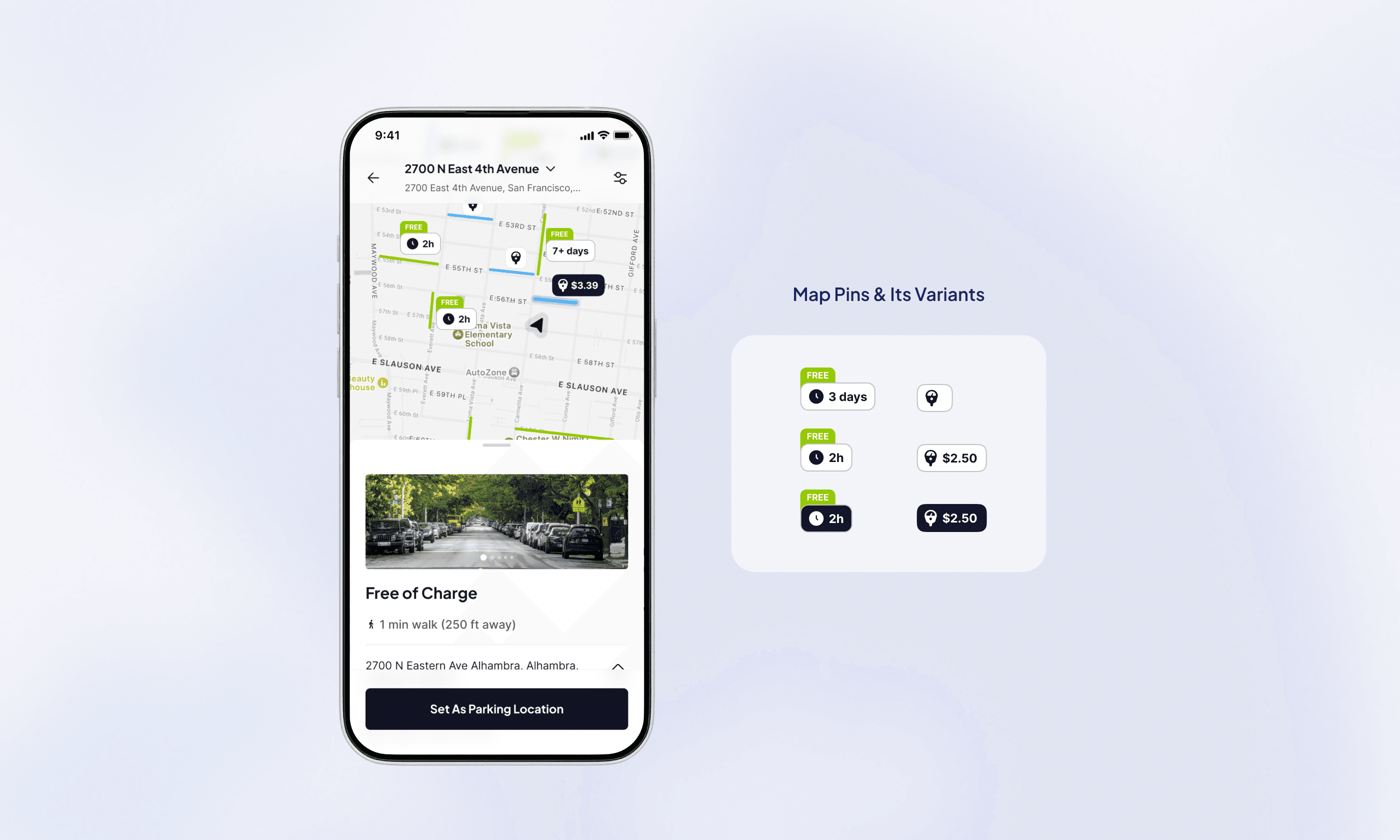 I have worked on the design for App for this project. The design & product strategy involved creating a real-time parking map that clearly displays color-coded zones, rules, and restrictions, with the ability to tap and view details like hours and tariffs. I added a straightforward action layer where users can set their parking location, view time limits, receive reminders, and move their car before violations occur.