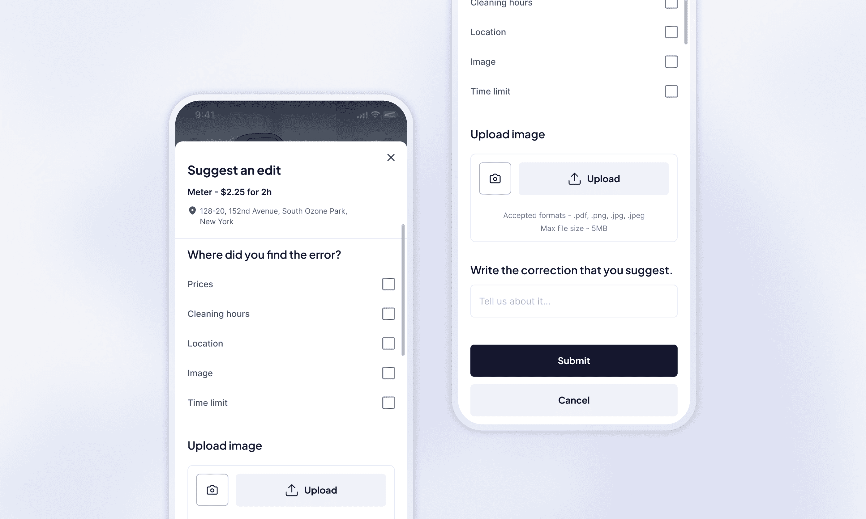 Users can submit corrections for parking data to improve accuracy. The type of issue, suggestiions, along with visual evidence can be submitted.