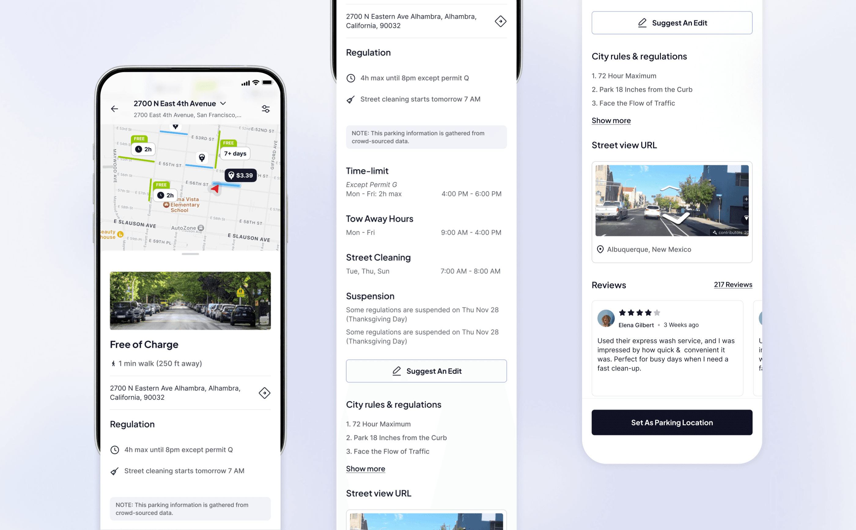 This floating parking detail page has all informations regarding parking, like time limit, city rules & regulations,, towin hours, street cleaning info, street view and reviews.