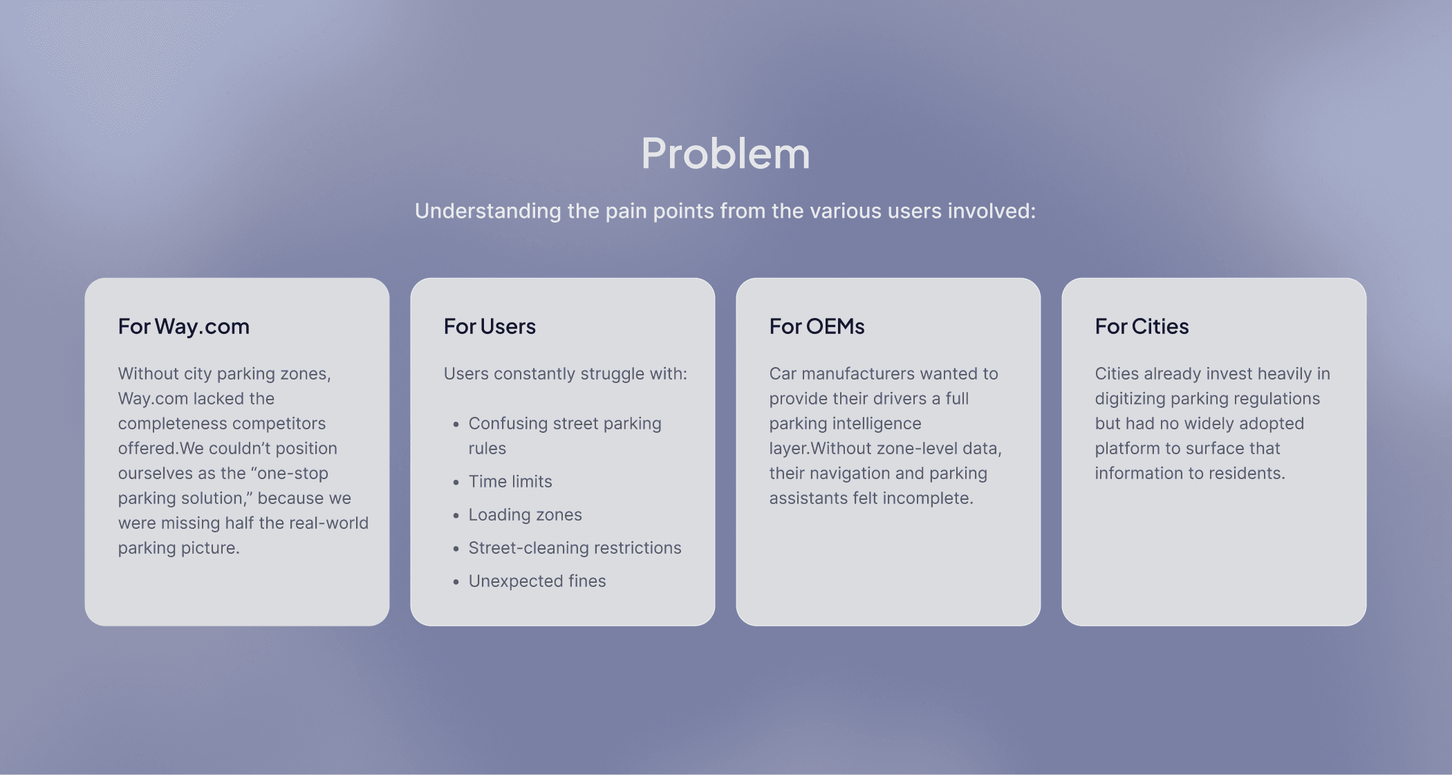 While exploring this problem, I realized the real challenge was not just finding a parking spot but the lack of clear and accessible information about city-owned parking zones. Despite Way.com being a major parking platform, we did not display these zones, whether free or paid.